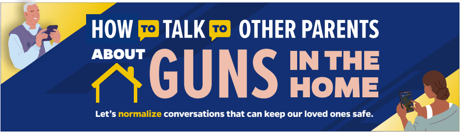 Asking about firearm storage may feel awkward at first, but it’s just as important as other safety topics we’re used to talking about, like allergies and pets. Keeping guns unloaded and locked up prevents unauthorized users—including children—from accessing and then being injured by firearms. This tip sheet from Johns Hopkins University can help you start the conversation.